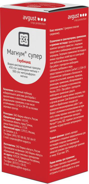 - Действующие вещества: трибенурон-метил, 450 г/кг и метсульфурон-метил, 300 г/кг (трибенурон-метил и метсульфурон-метил относятся к химическому классу производных сульфонилмочевины, обладают системным действием)